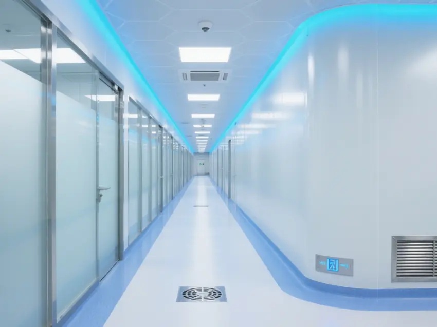 整個車間以白色為主色調,搭配藍色的燈光裝飾,營造出一種干凈、專業(yè)且略帶科技感的氛圍。地面和墻面都采用了光滑的材質,便于清潔和保持衛(wèi)生。