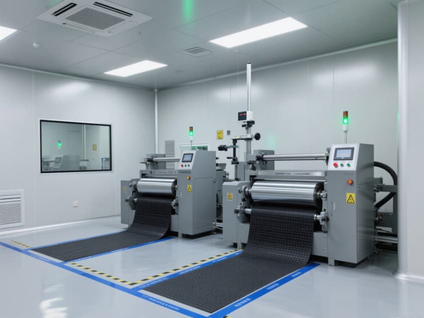車間以銀灰色抗菌金屬彩鋼板搭建墻體與吊頂,搭配淺灰色防靜電環氧地坪,金屬質感的建材兼具抗電解液腐蝕、易清潔特性,地面藍色防靜電標識線清晰劃分涂布、卷繞、裝配等工序區域。頂部高效過濾器與定向層流系統,實現每小時18-22次空氣置換,配合除濕機組將濕度精準控制在20-30%RH,避免水分影響電芯性能。?