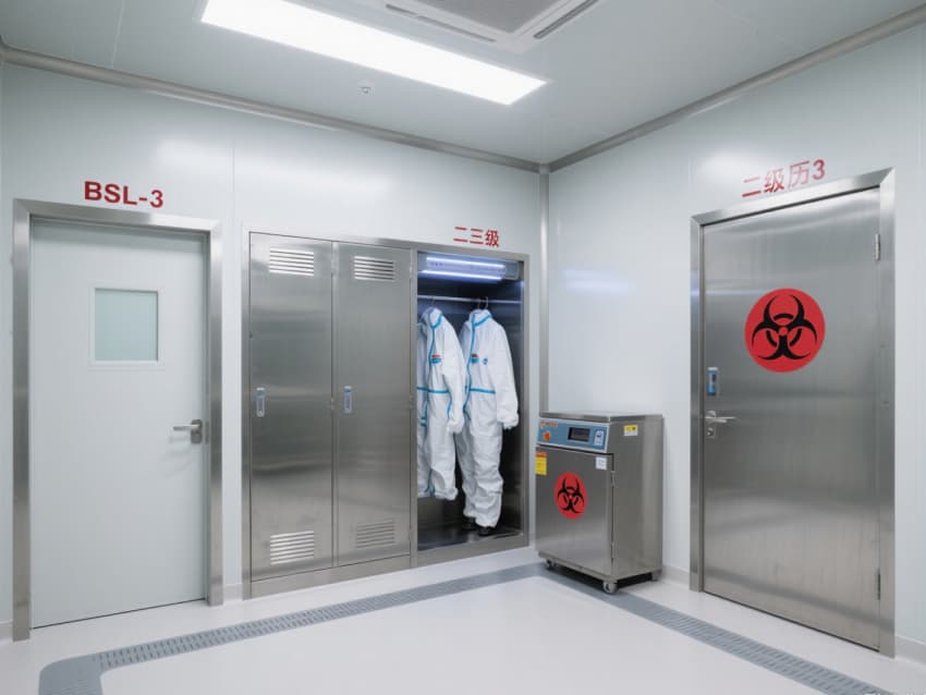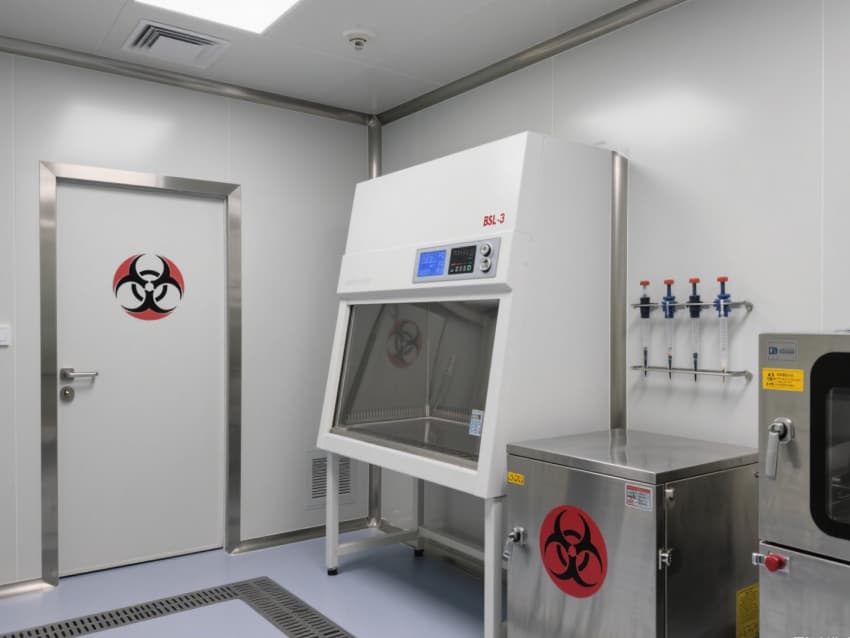 實驗室核心區域配備負壓生物安全柜、雙扉高壓滅菌器,確保微生物操作與廢棄物處理安全;頂部高效空氣過濾器(HEPA)實現每小時15-20次空氣置換,尾氣經消毒處理后排放,避免氣溶膠擴散。互鎖式潔凈門、雙層鋼化玻璃觀察窗與應急噴淋裝置,形成全流程安全保障。?