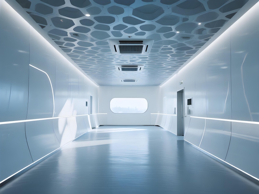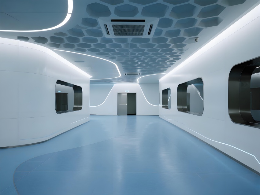 本車(chē)間空間以冰川藍(lán)與鈦白為主色調(diào),弧形墻角與無(wú)縫地坪構(gòu)成流暢的潔凈界面,頂部蜂窩狀FFU陣列形成科技感天花肌理。灌裝區(qū)透明亞克力防護(hù)罩展示自動(dòng)化生產(chǎn)線運(yùn)作,配合層流工作臺(tái)的紅色氣流可視化設(shè)計(jì),強(qiáng)化無(wú)菌核心概念。功能模塊通過(guò)地面灰色導(dǎo)視帶串聯(lián),設(shè)備區(qū)的鏡面不銹鋼與控制面板的藍(lán)色背光形成冷調(diào)光效。玻璃觀察窗嵌入電子壓差計(jì),走廊的漸變光環(huán)境引導(dǎo)系統(tǒng)在滿足GMP動(dòng)態(tài)監(jiān)測(cè)要求的同時(shí),營(yíng)造出未來(lái)實(shí)驗(yàn)室般的專業(yè)氛圍,緩解員工長(zhǎng)時(shí)間密閉作業(yè)的疲勞感。
