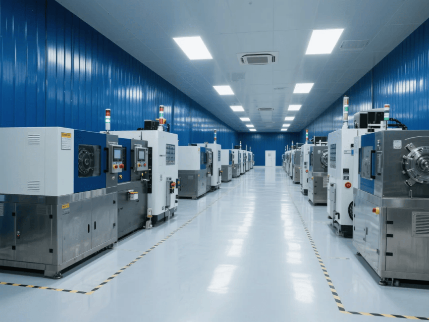 智能控制系統集成環境監測、設備聯動與生產看板,深藍墻面上嵌裝LED數據顯示屏,實時反饋工藝參數。照明系統采用600x600mm潔凈平板燈,色溫5000K,重點工位增設局部補光。整體設計通過冷色調的工業美學與自動化產線融合,構建高效、精準的現代化注塑生產空間。