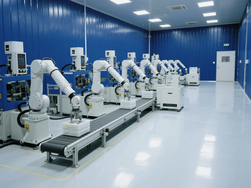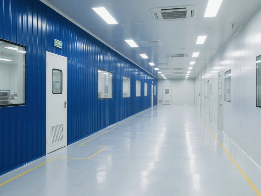 車間采用模塊化潔凈結構,50mm厚深藍抗菌彩鋼板墻體搭配圓弧收邊工藝,確保無塵死角。自動化注塑機與機械臂工作站呈流水線布局,設備區采用淺灰不銹鋼圍擋,與深藍墻體形成鮮明對比。吊頂系統配置FFU高效過濾單元,維持≥25次/h換氣次數,氣流組織采用頂送側回模式,確保溫濕度與潔凈度穩定。
