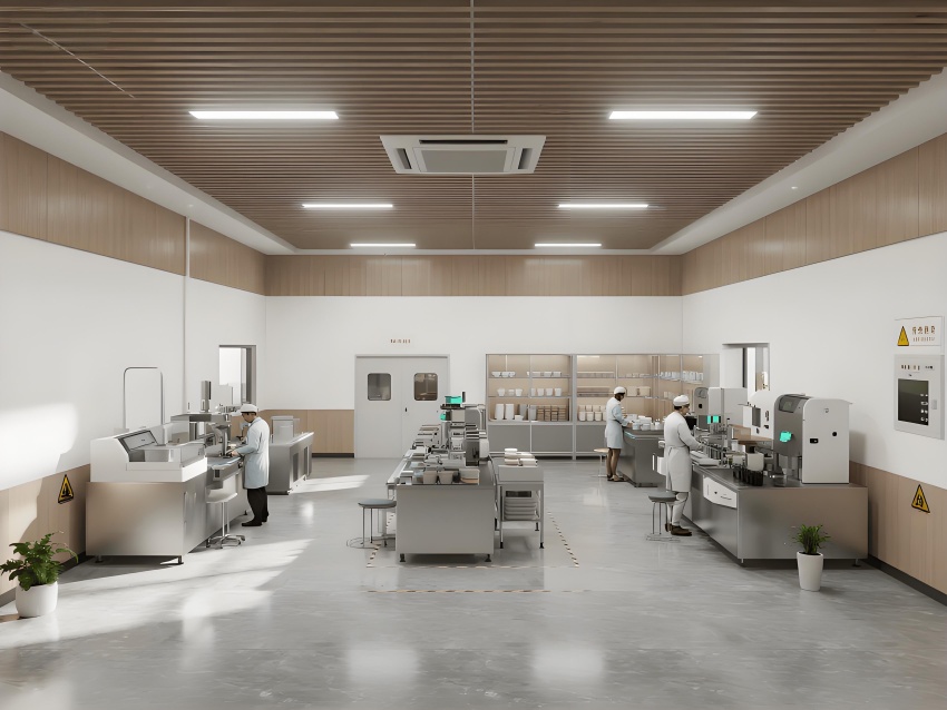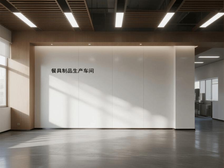 本餐具制品車間設(shè)計(jì)以現(xiàn)代簡(jiǎn)約工業(yè)風(fēng)為核心,融合高效生產(chǎn)與視覺舒適性。色調(diào)以純凈白(墻面)、淺木色(倉(cāng)儲(chǔ)柜)和不銹鋼銀灰(設(shè)備)為主,營(yíng)造清爽專業(yè)的氛圍。
