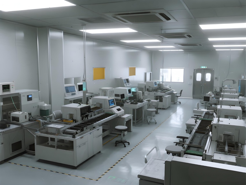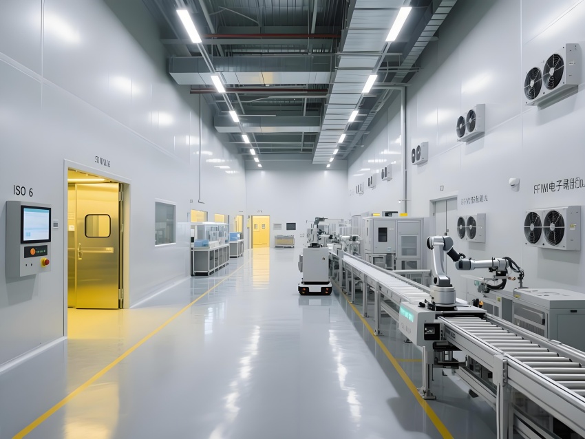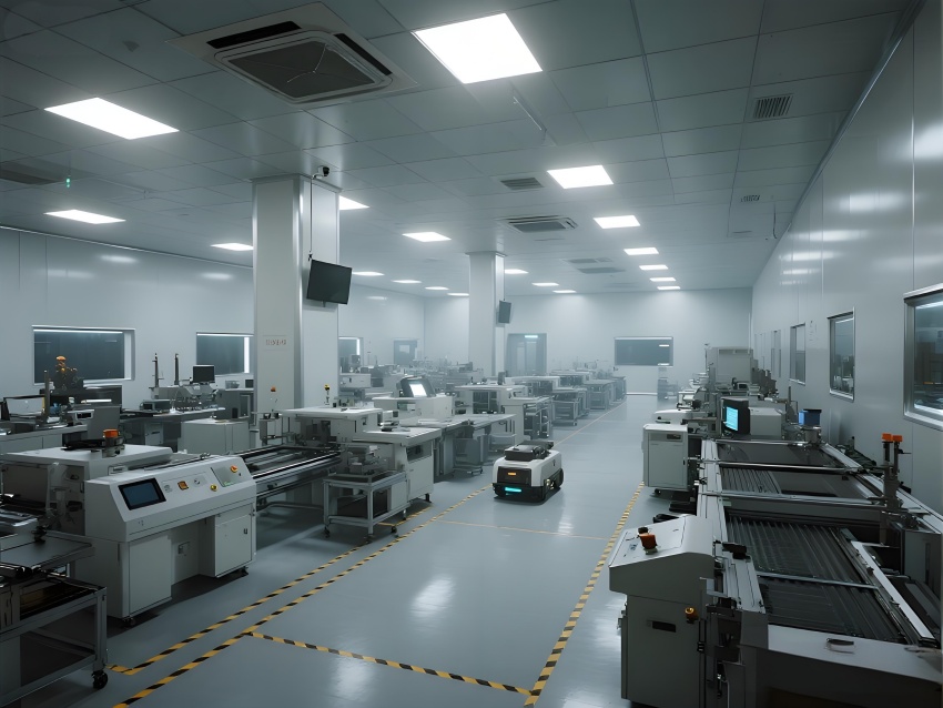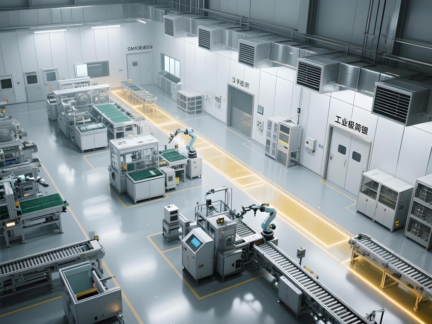 本車間以"精密工業美學"為設計主題,構建銀灰色主調的科技制造空間。頂棚矩陣排列的FFU單元形成蜂巢狀光影,與地面熒光綠流線導向標識構成三維潔凈動線。防靜電環氧地面嵌入銅絲導電網,墻面采用陽極氧化鋁板與可視壓差監測窗。核心SMT區配備全自動懸吊式貼片機群,紅色激光校準射線在設備間交織。黃光作業區采用琥珀色漫射照明,與普通區的冷白光形成鮮明功能區分。透明亞克力防塵簾分隔各工序段,AGV機器人沿藍色磁軌無聲穿梭。數據看板懸浮顯示實時良率與溫濕度參數,頂部螺旋風管配合地面回風口形成垂直層流。整體通過金屬冷質感與智能交互元素的碰撞,打造兼具工業嚴謹性與未來科技感的精密制造環境。