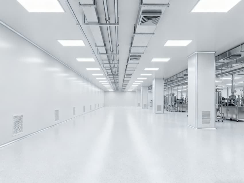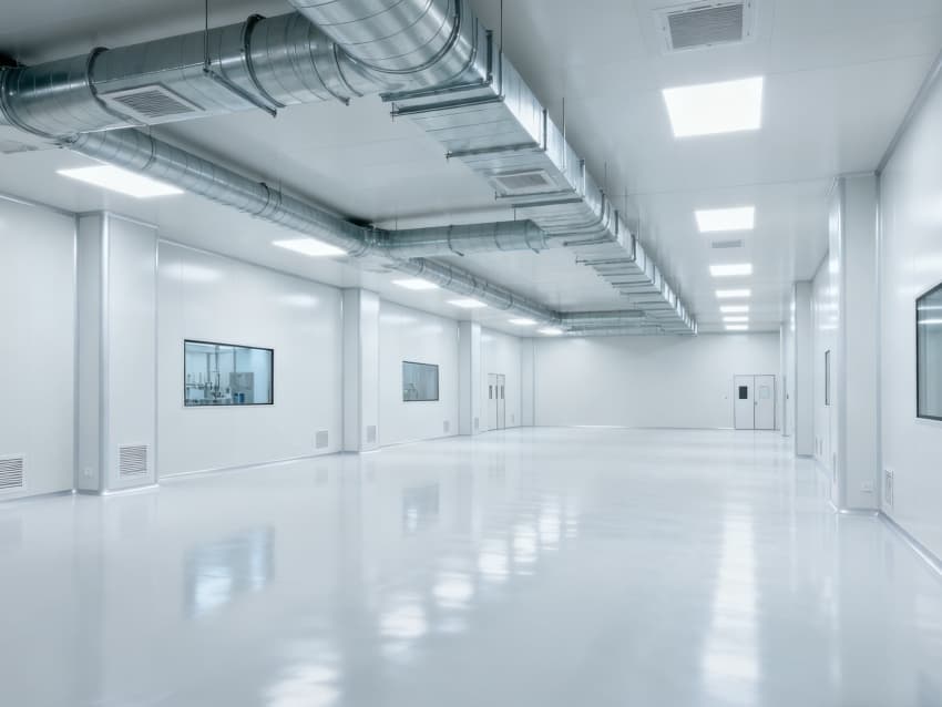 內部6個核心生產車間均為無設備空曠布局,按萬級潔凈標準打造:地面鋪設無縫環氧自流平,墻面采用食品級不銹鋼墻板,陰陽角做圓弧處理,杜絕積塵死角;空間柱網間距均勻,預留充足設備安裝點位與運維通道,滿足后續柔性生產需求;頂部吊頂整合新風系統與防眩光照明模塊,風口布局對稱規整,進一步強化空間的空曠感與規整性,為生物制藥生產的潔凈性、安全性與可擴展性奠定堅實基礎。