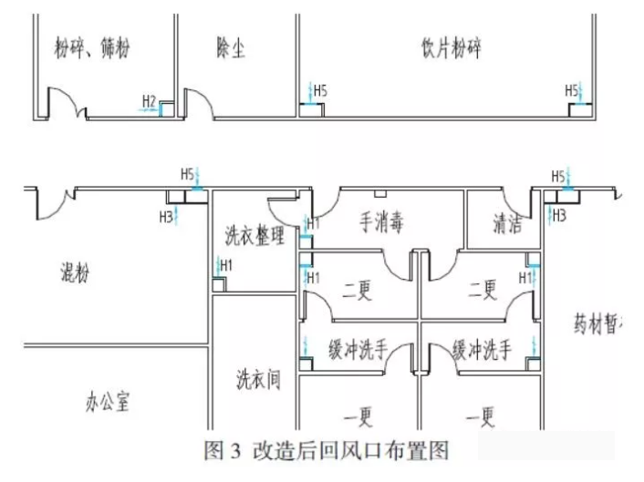 根據(jù)生產(chǎn)工藝及正壓要求,不同正壓值要求房間分設(shè)回風柱,各在回風口或回風管接閥門進行調(diào)節(jié),回風口設(shè)過濾網(wǎng)。另外,飲片粉碎、混粉等污染潔凈間,在靠近污染工藝設(shè)備處設(shè)排風口,及時把產(chǎn)生的污染空氣排出潔凈室外。改造后經(jīng)調(diào)試,潔凈區(qū)與普通區(qū)壓差+10Pa,潔凈走廊與混粉等污染房間壓差+5Pa,測試正壓值和潔凈度一次通過,運行近兩年也沒出現(xiàn)問題。