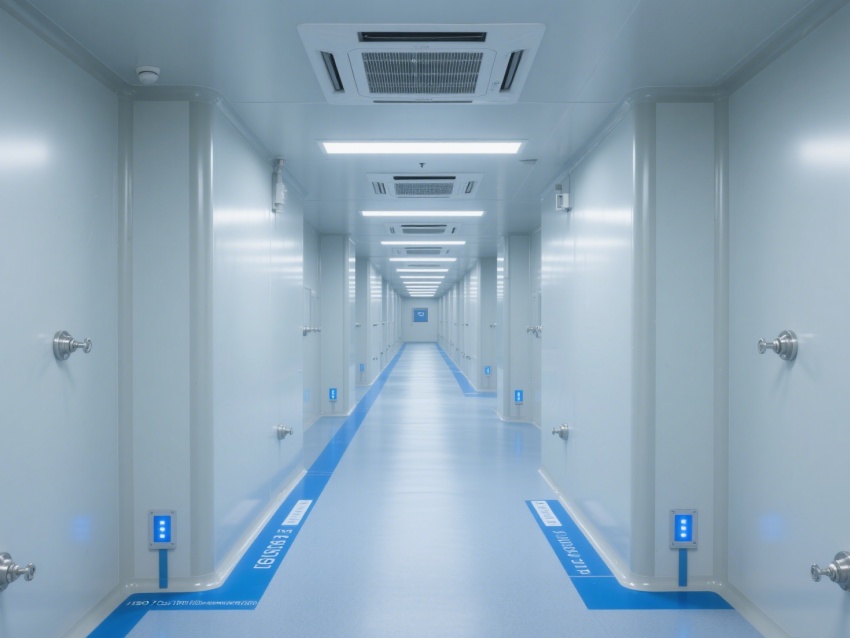 走廊采用一體化潔凈設(shè)計(jì),地面藍(lán)色標(biāo)識(shí)線清晰規(guī)劃動(dòng)線,各類管線與設(shè)備布局兼顧功能性與美觀性。整體工程通過材質(zhì)選用、空氣凈化、智能監(jiān)控的協(xié)同,為芯片檢測提供了超潔凈、高穩(wěn)定的專業(yè)環(huán)境,有力保障芯片檢測的精度與可靠性,是芯片研發(fā)與質(zhì)量把控的核心技術(shù)支撐單元。