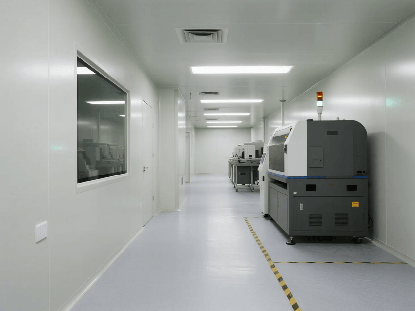 圍護系統:50mm厚白色抗菌彩鋼板墻體,接縫采用無縫焊接工藝,配合R30mm圓弧收邊,確保無粉塵積聚死角;
